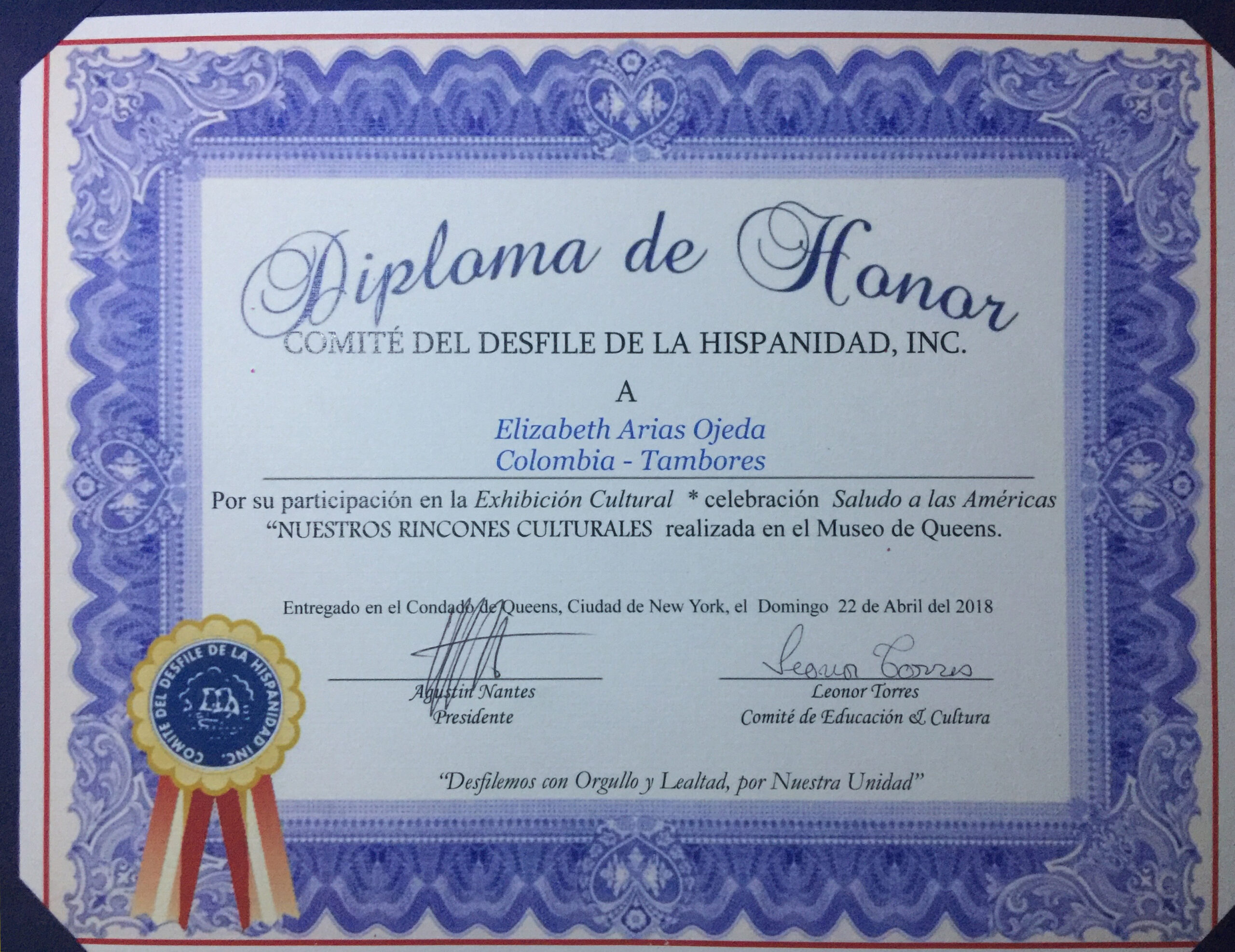 Diploma de Honor Comité del Desfile de la Hispanidad Inc.