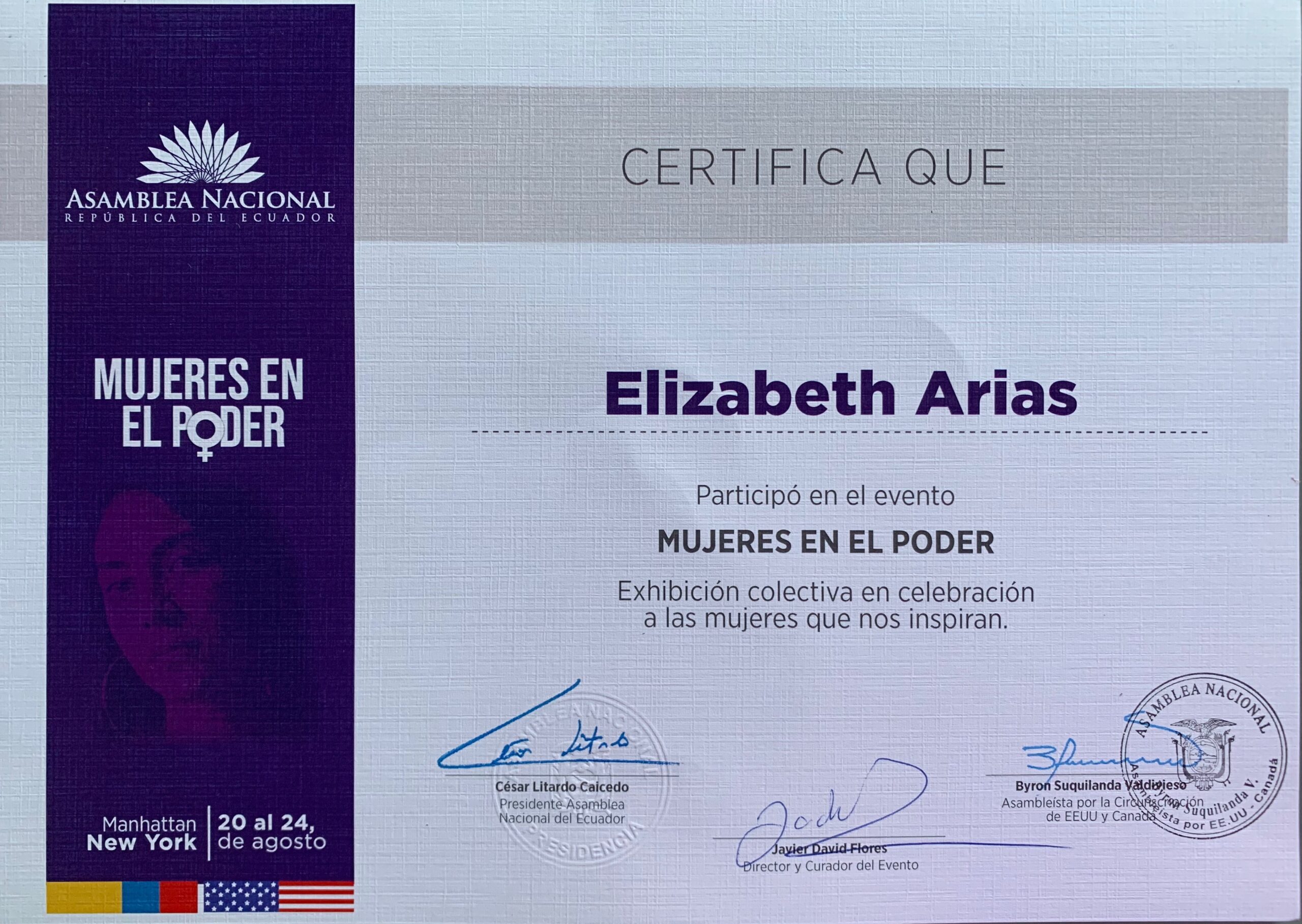 Certificado de la Asamblea Nacional de la República del Ecuador, donde incluyeron mi obra en óleo de prevención del cáncer para la invitación al evento MUJERES EN EL PODER