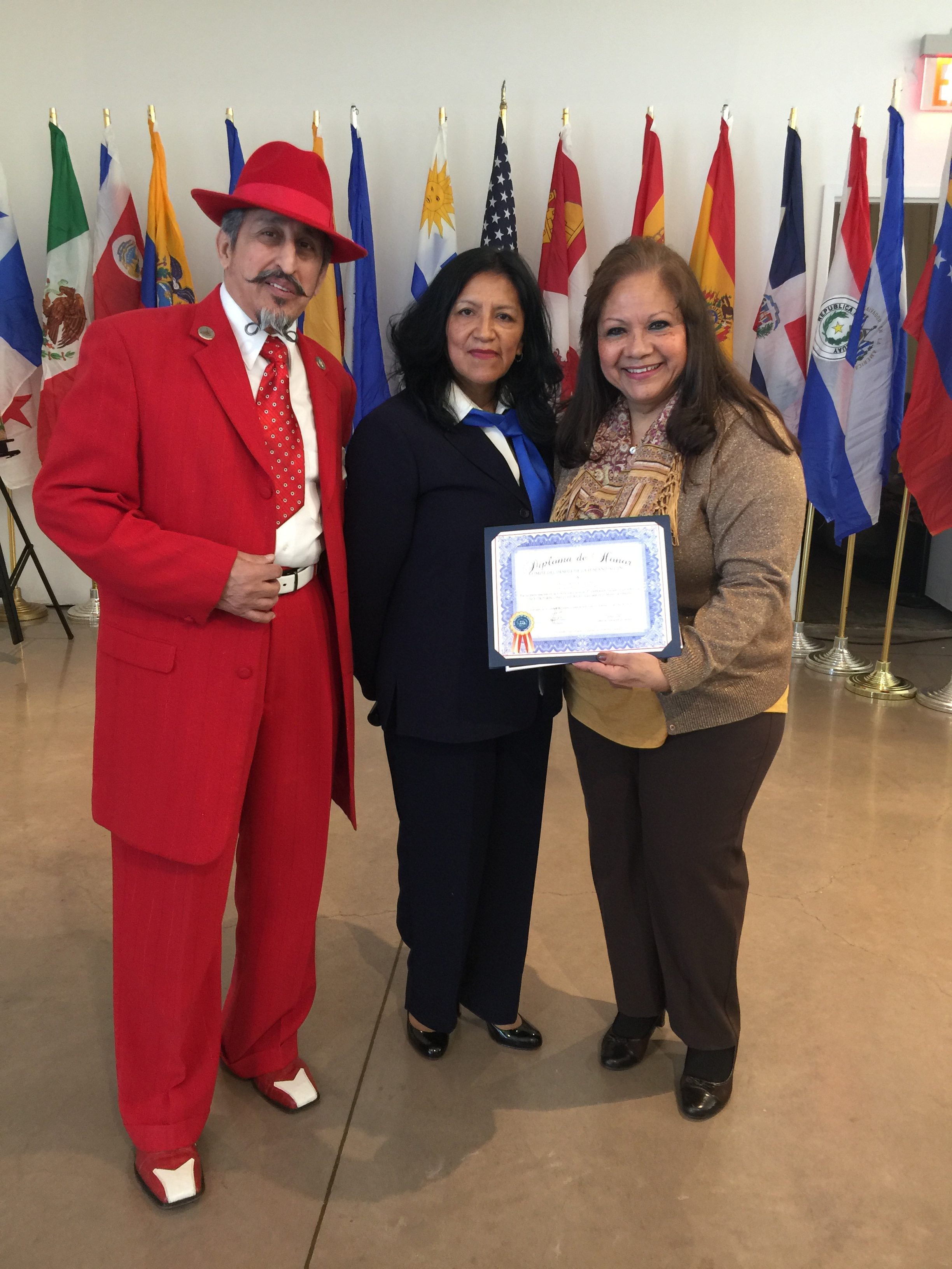Recibiendo el certificado de manos de Leonor Torres y Amado Mora, Curador